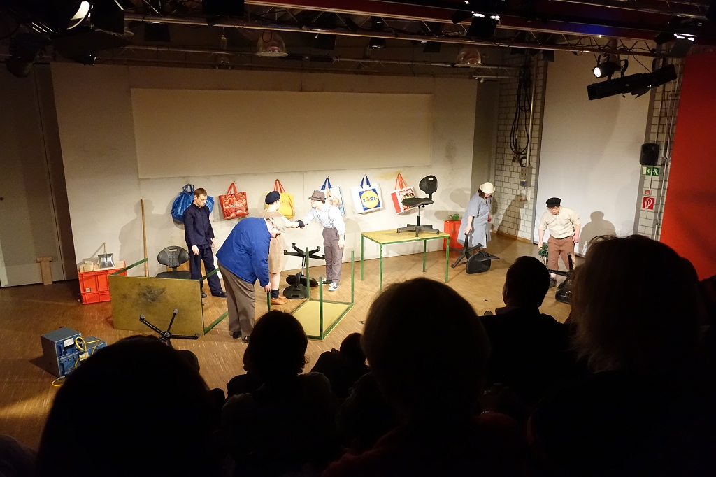 Im Langtext – während des gestrigen Stammtisches waren einige von uns der Einladung der Lebenshilfe Würzburg zu einem kleinen Empfang und dem Theaterstück „Frohes Schaffen“ im Theater Augenblick gefolgt.