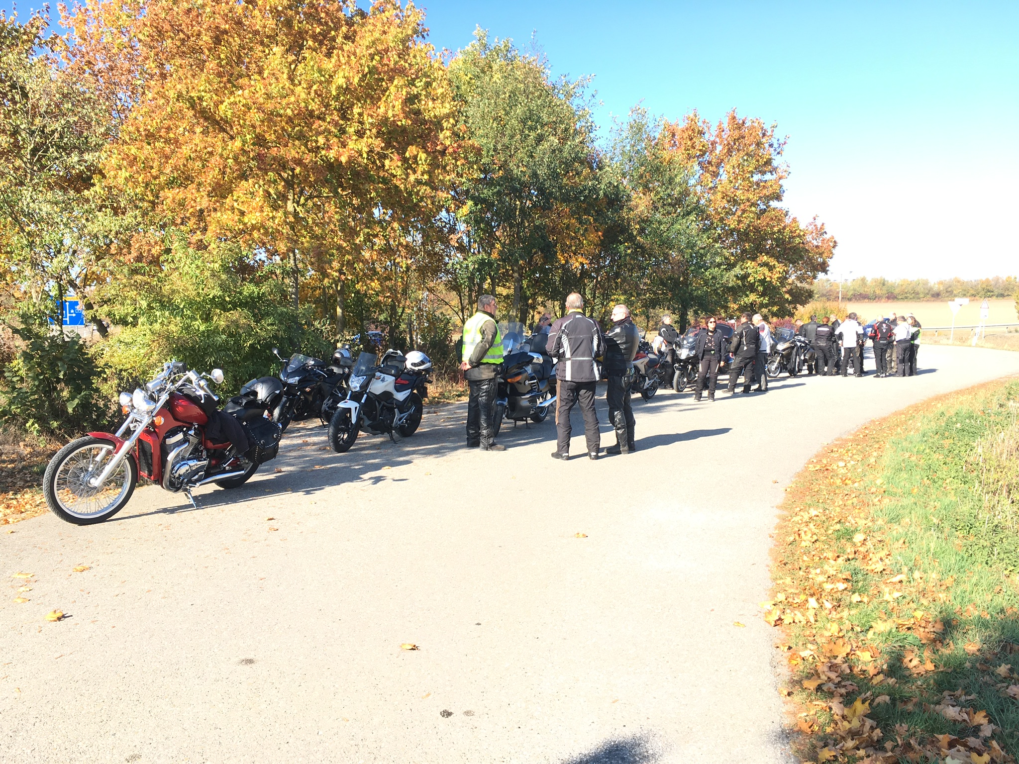 Etwas Bedenken hatte ich schon, angesichts der 21 Maschinen, die da mehr oder minder sauber aufgereiht zur Abfahrt standen. O.k., ein Ausfall wegen Motorproblemen kurz nach Mainbernheim (er ist aber wieder gut heim gekommen und hat die Maschine schon wieder gerichtet), sonst lief es trotz Obstbäumen, etwas nur ganz wenig Schotter und dem Sonntagsverkehr einwandfrei. Die zwei hübschen Wendeschleifen haben wir fahrerisch und emotional auch gut gemeistert.