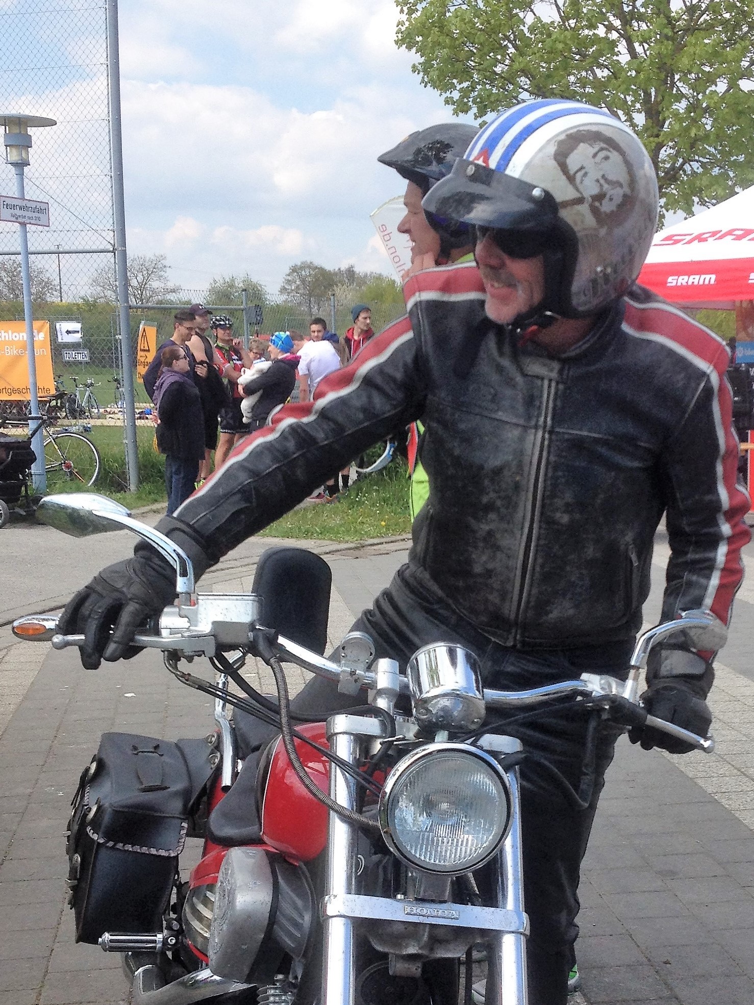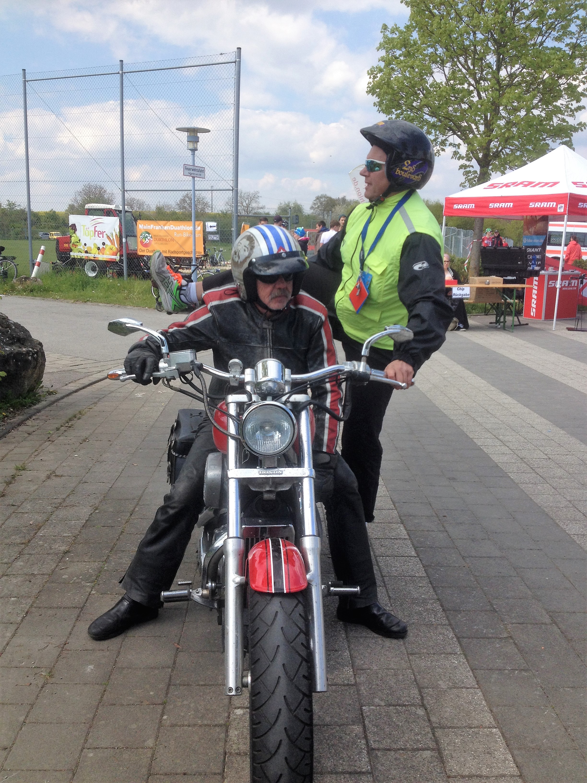 Einen Tag vor unserer ersten VMT Tour 2017 genau das Richtige zum Aufwärmen – wir sind gebeten, mit 3 Maschinen die Kampfrichter zu fahren, wenn mittags die Athleten im Massenstart mit den Rennrädern für eine Runde auf die Strecke gehen. Da Windschattenfahren und Nebeneinanderherfahren verboten sind, haben die Kampfrichter auch sicher einiges zum Kampfrichtern – sprich, es wird wie meistens recht unterhaltsam.